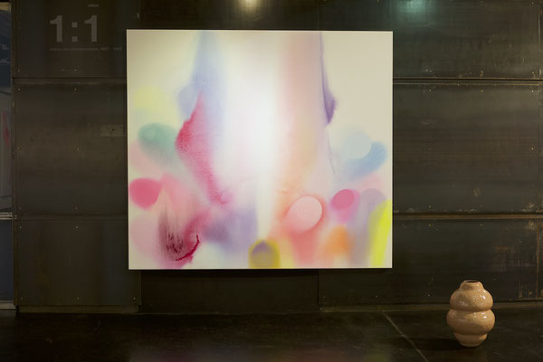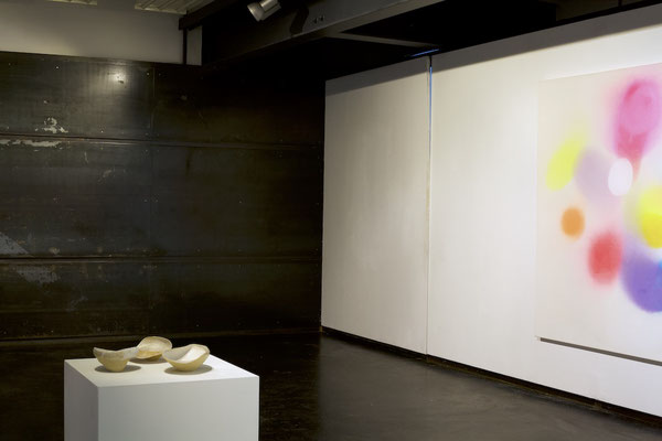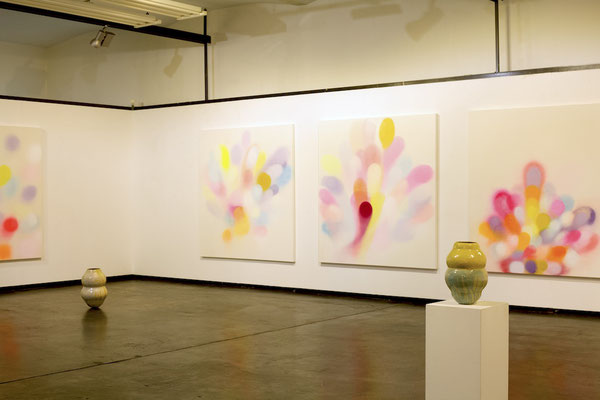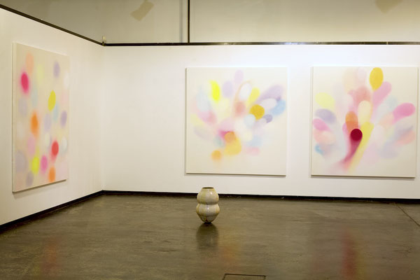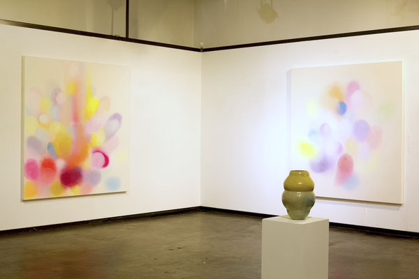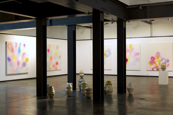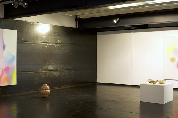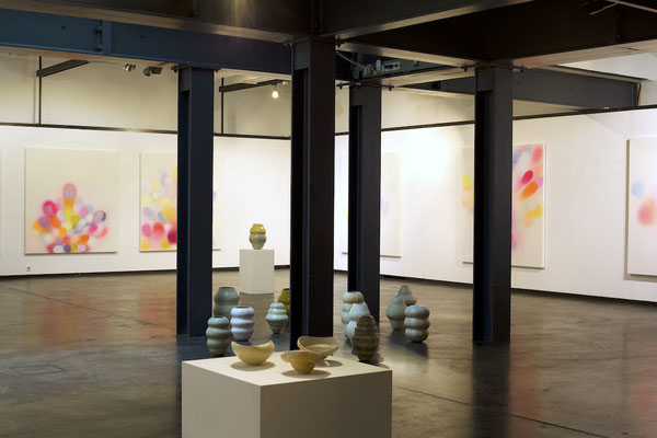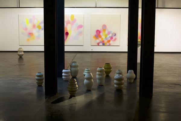 Die Malerei, als gefühltes Raumerleben und Ausdruck einer unendlichen Fülle, verbindet sich mit der gefassten Leere der keramischen Gefäßobjekte.